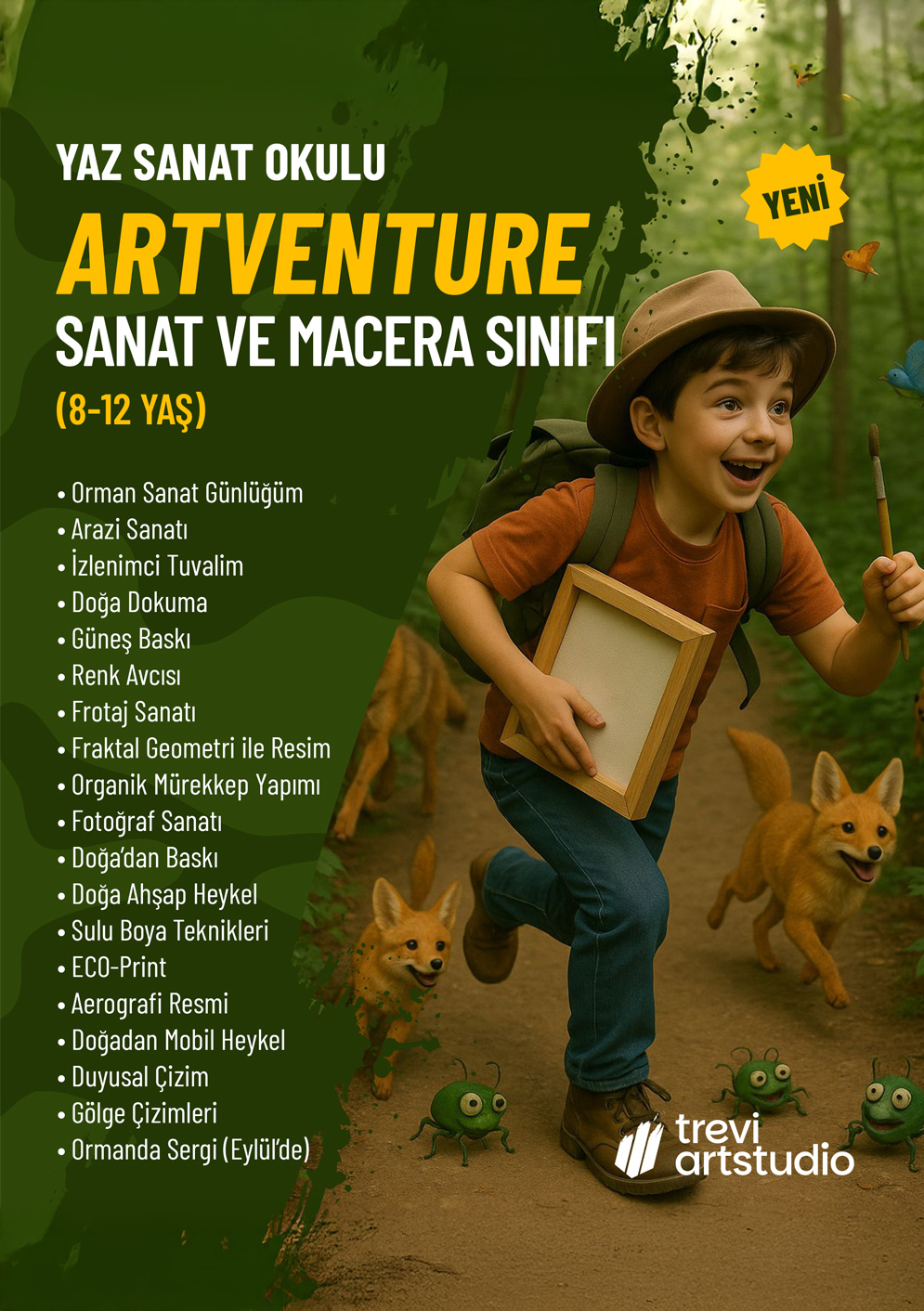 Doğa ile iç içe, sanatla dolu bir yaz seni bekliyor. ARTVENTURE- Sanat ve Macera sınıfı 8-12 yaş çocuklar, ormanın kalbinde sanat üretmenin heyecanını yaşayacak. Doğa dokuma, Güneş baskı, Organik mürekkep yapımı, Doğadan heykel ve daha fazlası bu programda!